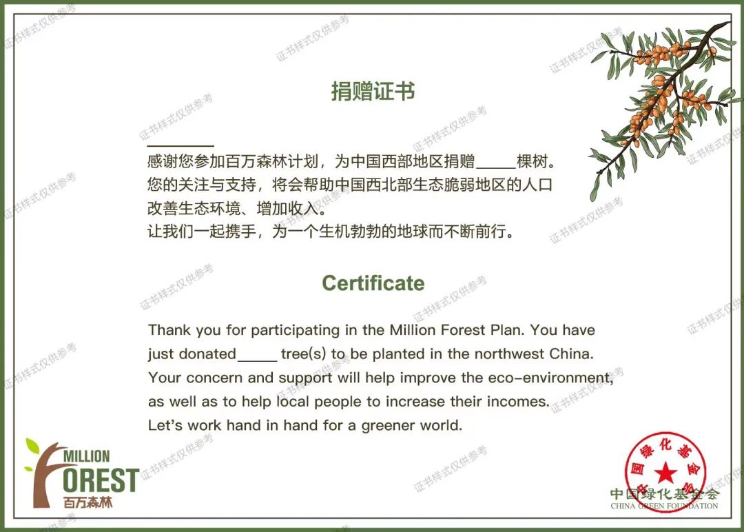 活動(dòng)期間,凡購買(mǎi)一單恒安標準人壽保險產(chǎn)品,經(jīng)過(guò)猶豫期后,就能以您的名義認捐一棵樹(shù),助力沙漠生態(tài)環(huán)境修復和生物多樣性平衡,還能獲得由中國綠化基金會(huì )授予的捐贈證書(shū)。